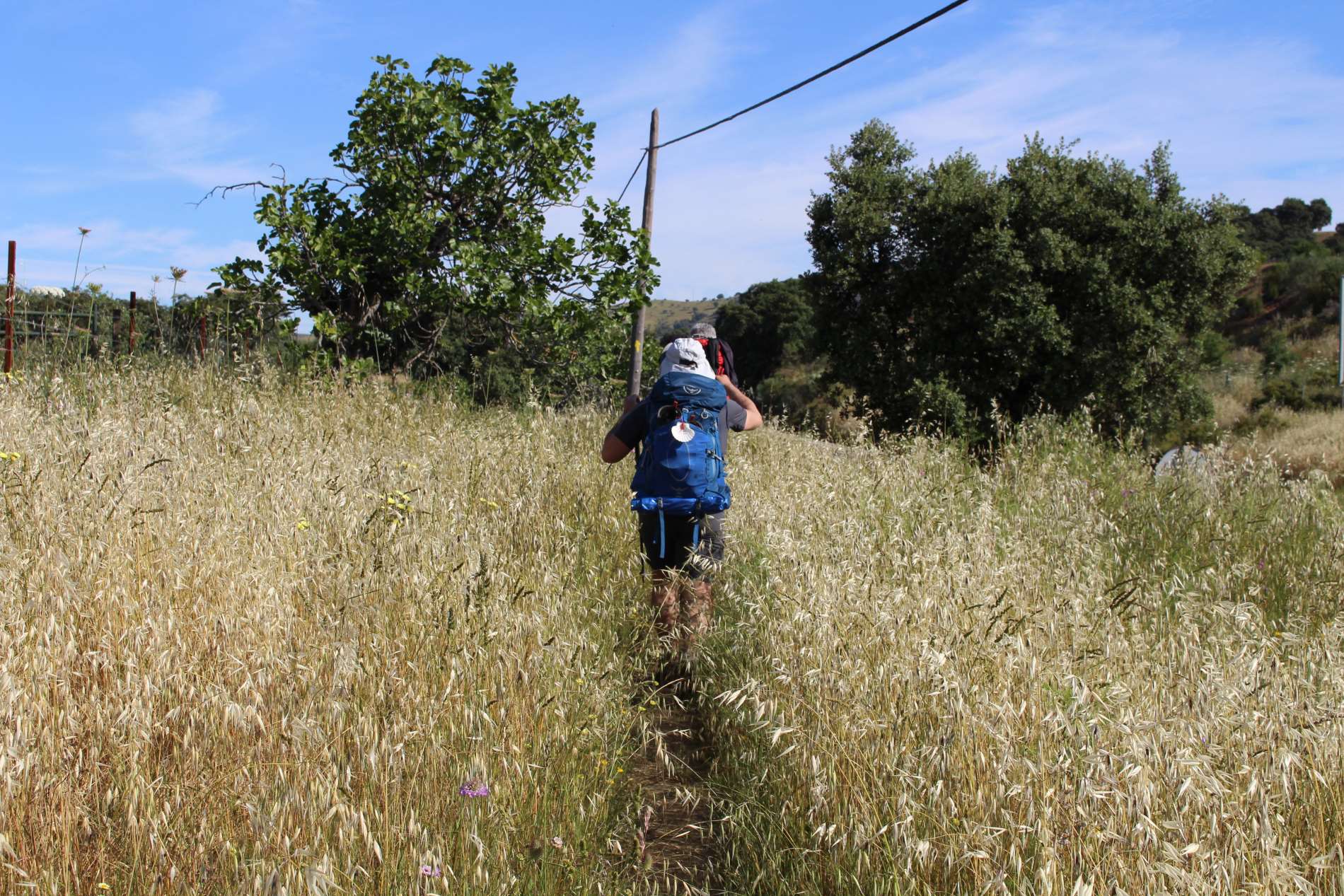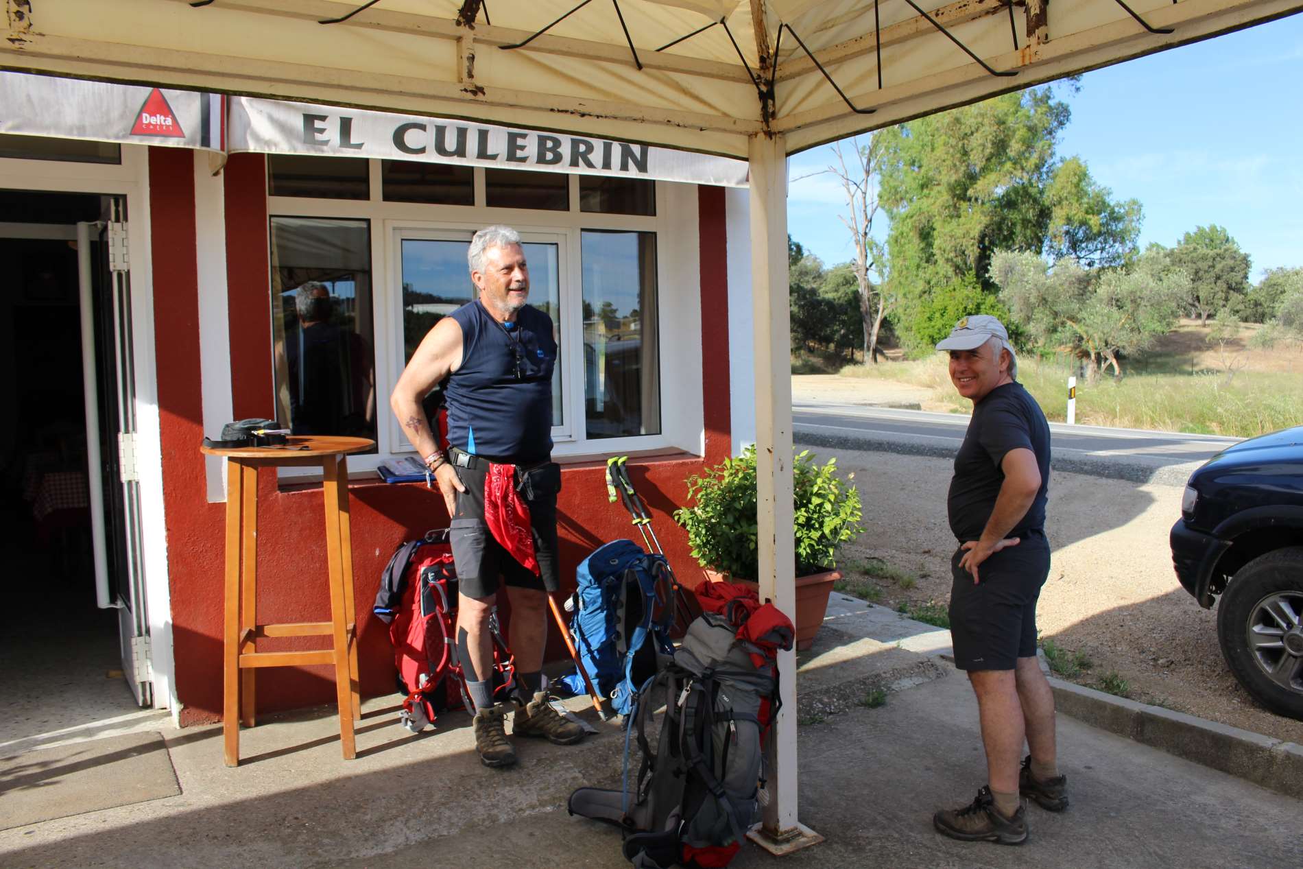 Um 6 Uhr gibt es Frühstück. Danach laufen wir los. Michele, Antonio und ich laufen gemeinsam. Heute ist der geschotterte Weg fast ausnahmslos breit. Einzig in der Mitte der Etappe haben wir einen kleinen, fast zugewachsenen Pfad zu bewältigen. Die Landschaft ist einfach wunderbar und so überqueren wir gut gelaunt die Grenze zur Region Extremadura, der Name ist Programm. Bereits kurz nach elf erreichen wir unser heutiges Etappenziel. Heute bin ich im Hostal Extremadura mit Antonio in einem Zimmer. Dieses hat zwar ein eigenes Bad, aber das ist wirklich mikroskopisch klein. Beim Zähne putzen muss man hinter sich die Tür offen lassen. Monesterio ist die Hauptstadt des Jamon Iberíco. Hier gibt es sogar ein Schinkenmuseum!!! Also probieren wir fleißig Jamon Iberico, eine wirkliche Delikatesse. Ab morgen führen die Etappen, für die nächsten drei Tage, meist bergab. Bin mal gespannt, was meine Füße dazu sagen.