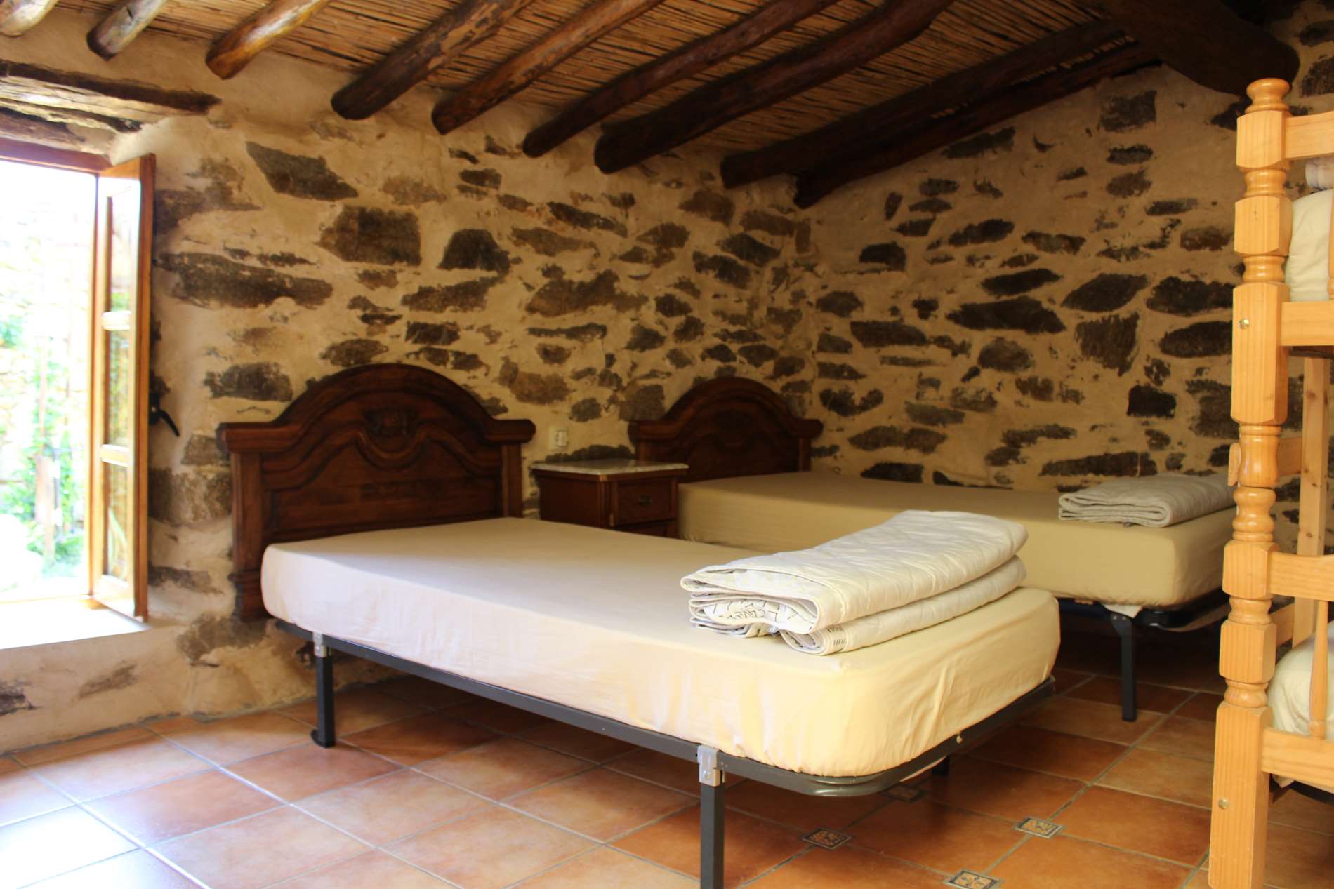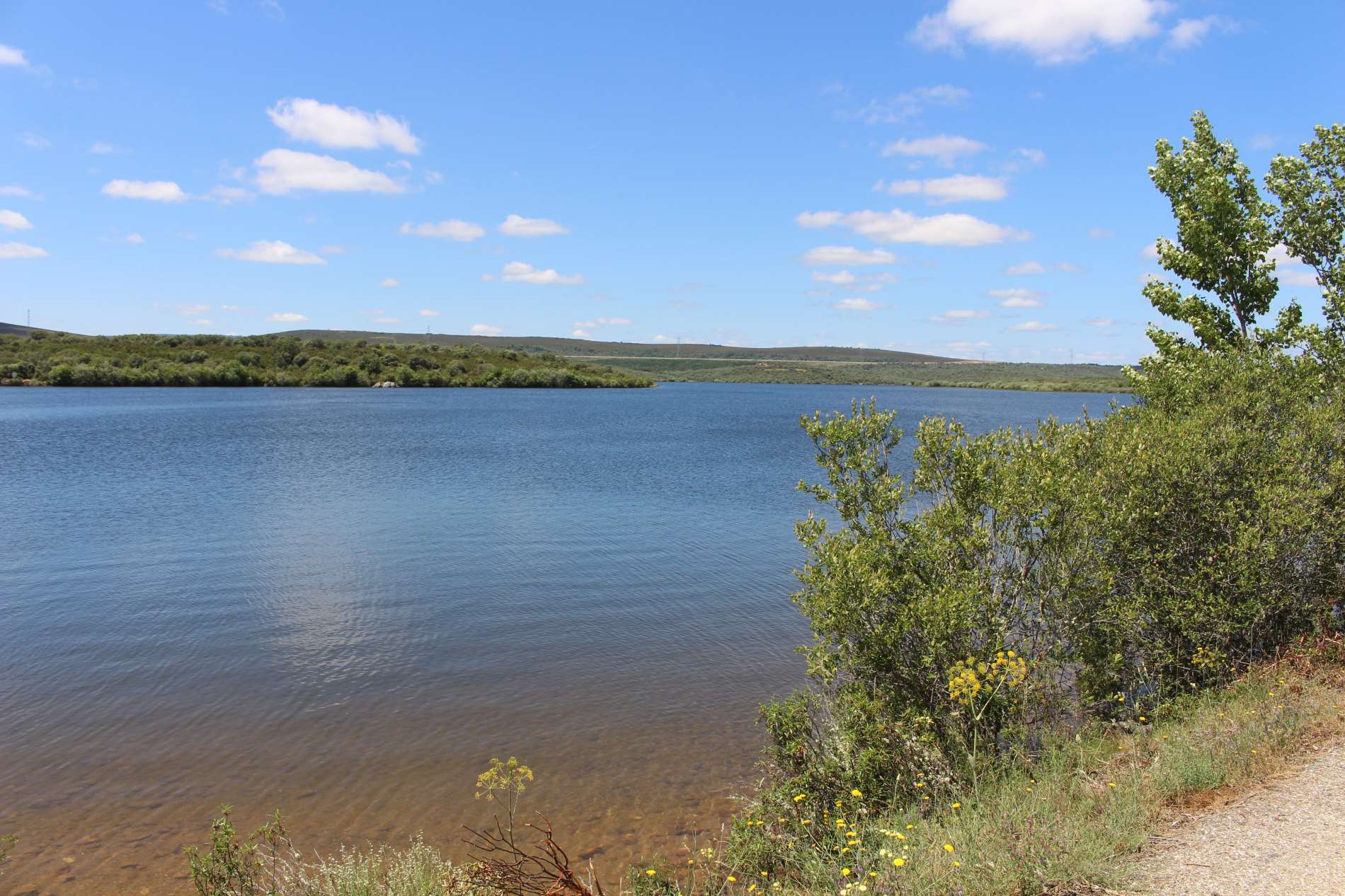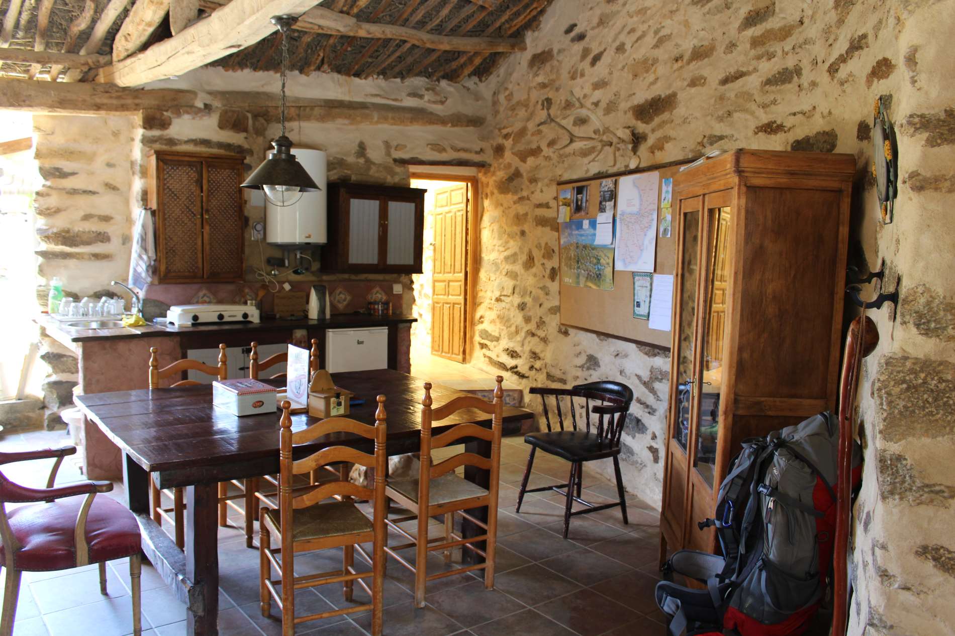My Home is my Castle. Seit heute geht es Richtung Westen. Das ist insoweit erwähnenswert, weil man die Sonne jetzt im Rücken oder auf der linken Seite hat und nicht mehr, wie die ganze Zeit, nur von rechts gegrillt wird. So habe ich die Chance auf eine gleichmäßige Bräune. Der heutige Weg tangiert meist nur kurz und selten befahrene Landstraßen. Die letzte ist so schmal, dass nicht mal zwei Autos aneinander vorbeikommen. Meine Füße bereiten mir keinerlei Probleme mehr und ich bewältige meine Etappe in etwas mehr als vier Stunden. Der Weg führt über eine Staumauer und danach an dem malerischen Stausee entlang zu einem kleinen Dorf, lediglich 7 Personen leben hier noch, ohne jeglichen Geschäfte und ohne Bar. Dafür habe ich wohl die kultigste Herberge entlang des ganzen Weges gefunden. Sie hat lediglich vier Betten und ist einfach nur traumhaft schön und rustikal. Hier wird einem alles gegen Spende zur Verfügung gestellt, inclusive Essen und Getränke.